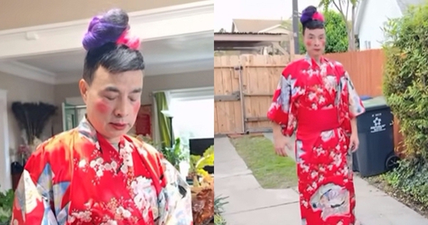 Một trong những điểm nhấn đáng nhớ chính là việc Tuấn Cảnh xuất hiện với lớp trang điểm sắc nét cùng chiếc kimono rực rỡ sắc màu. Bộ trang phục độc đáo này không chỉ tạo nên sự tương phản thú vị so với hình ảnh truyền thống mà còn thể hiện niềm đam mê văn hóa phương Đông sâu sắc. Kiểu tóc cầu kỳ kết hợp với lớp make up tinh tế giúp ông thêm phần nổi bật giữa đám đông.